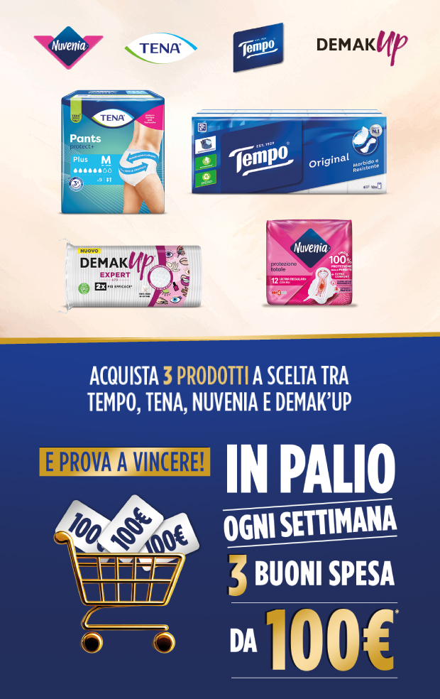 Dal 1 Marzo al 31 Dicembre 2026 acquista 3 prodotti a scelta tra Tempo, TENA, Nuvenia e Demak’up coinvolti