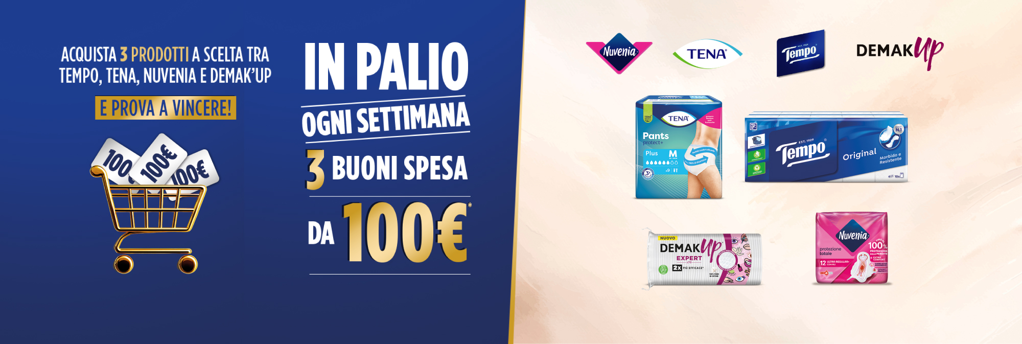 Dal 1 Marzo al 31 Dicembre 2026 acquista 3 prodotti a scelta tra Tempo, TENA, Nuvenia e Demak’up coinvolti